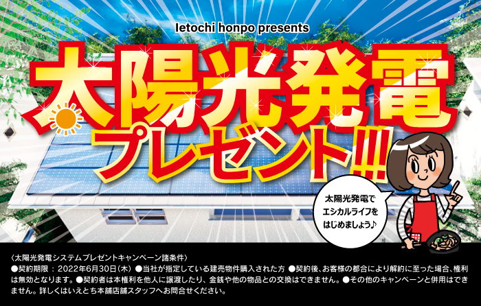 【対象の建売住宅ご契約で】太陽光発電プレゼントキャンペーン実施中!!エコライフ♪はじめませんか?
