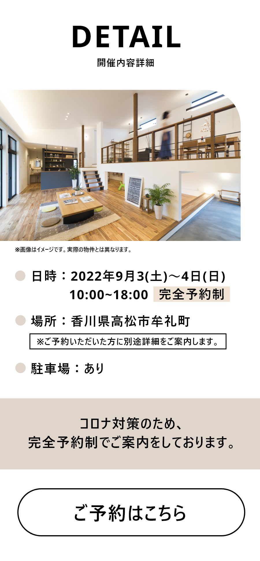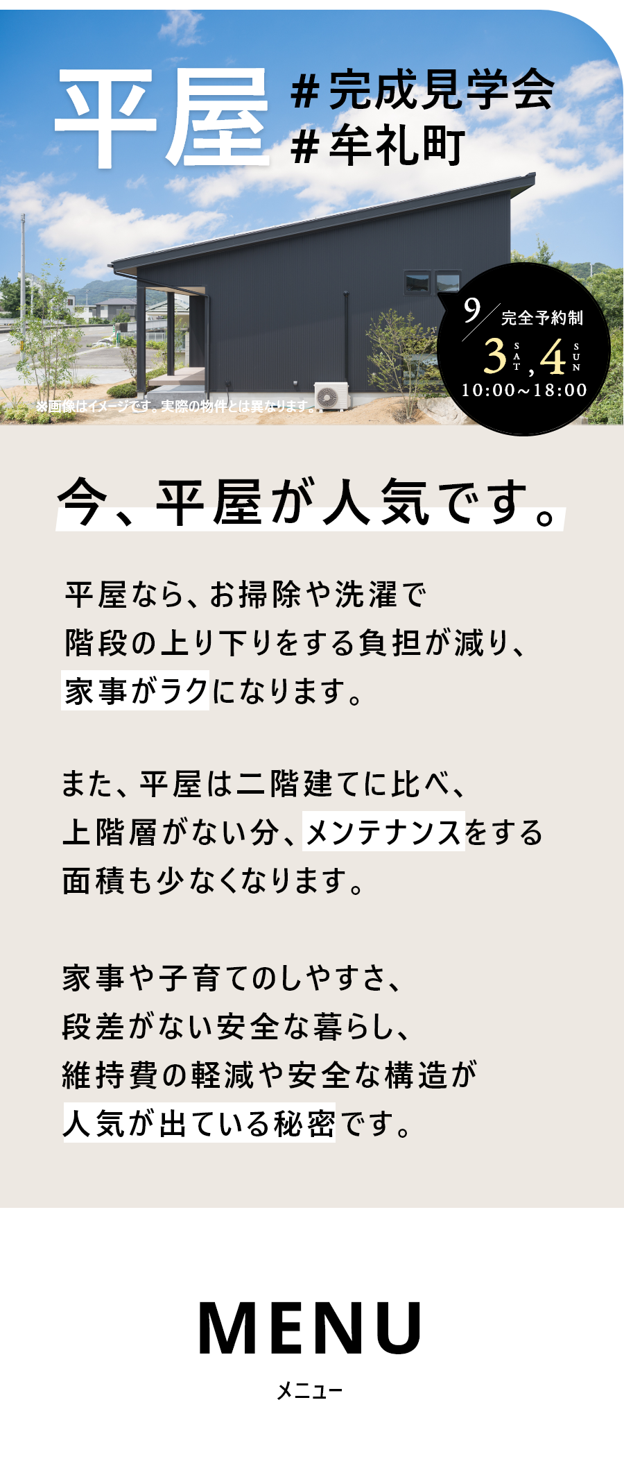 【平屋に住みたい】香川県牟礼町★完成見学会!9月3・4日限定開催!事前予約申し込み受付中
