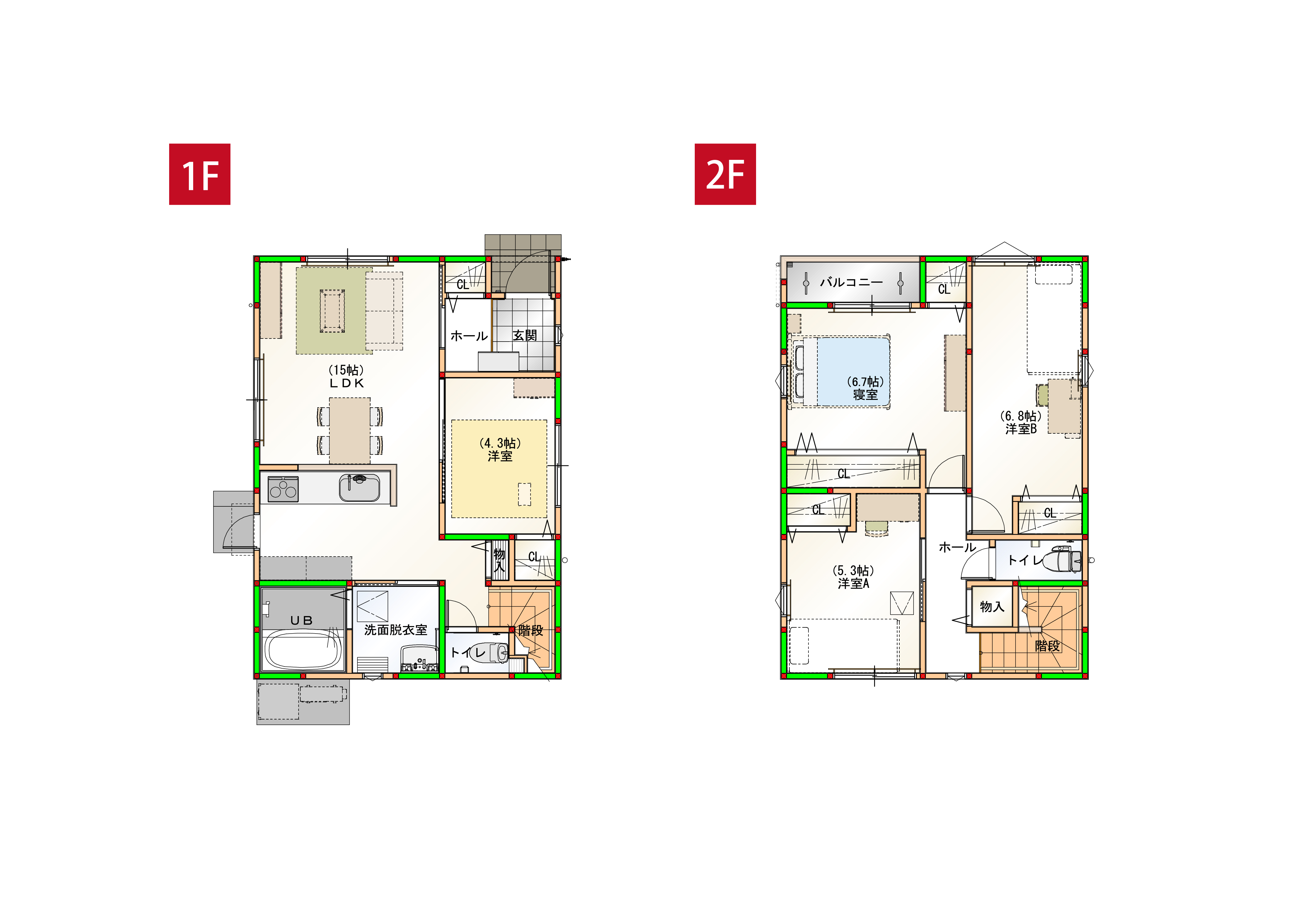 ★間取り:4LDK(1F:LDK15帖、洋室4.3帖、2F:寝室6.7帖、洋室5.3帖、洋室6.8帖)