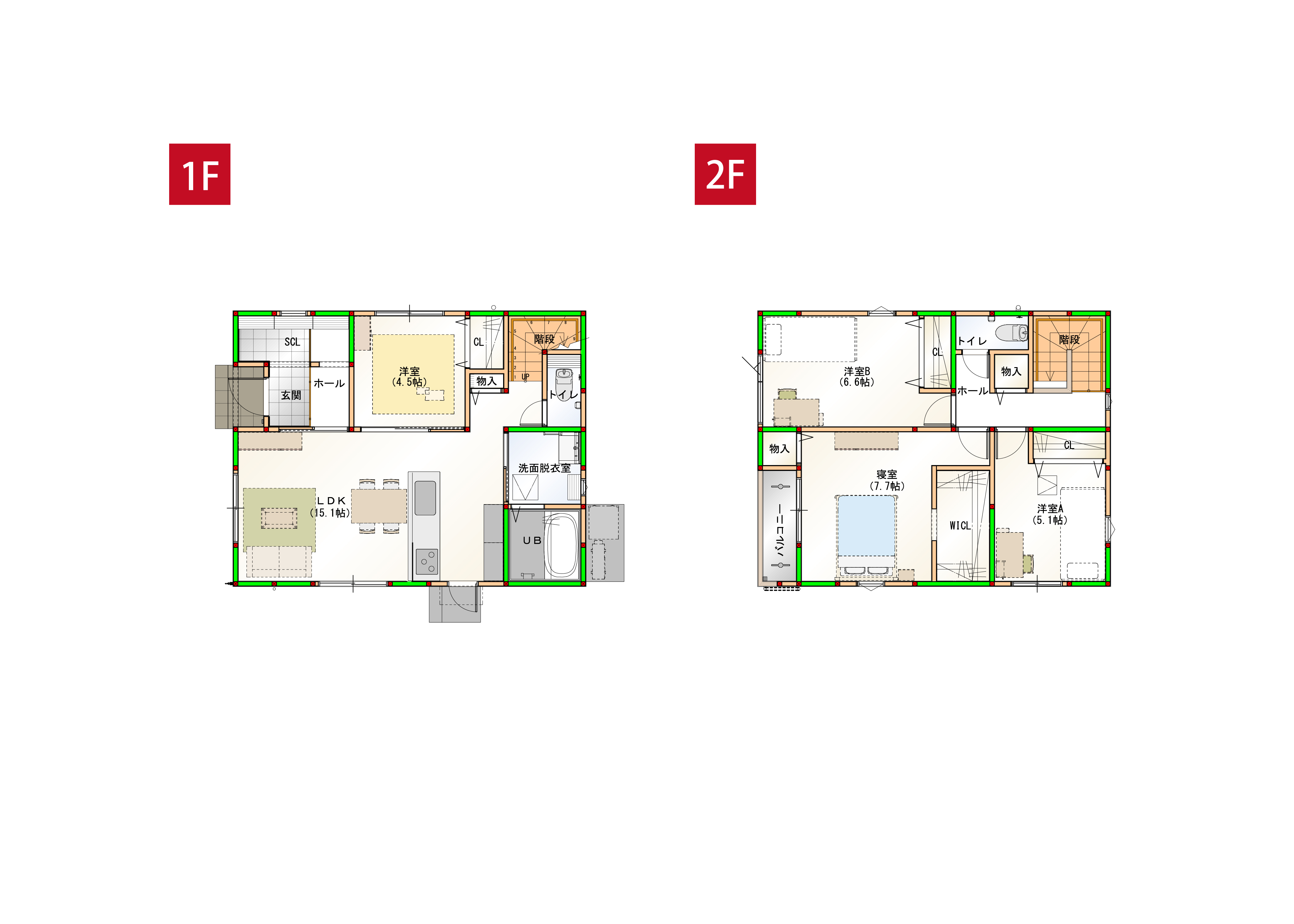 ★間取り:4LDK(1F:LDK15.1帖、洋室4.5帖、2F:寝室7.7帖、洋室5.1帖、洋室6.6帖)