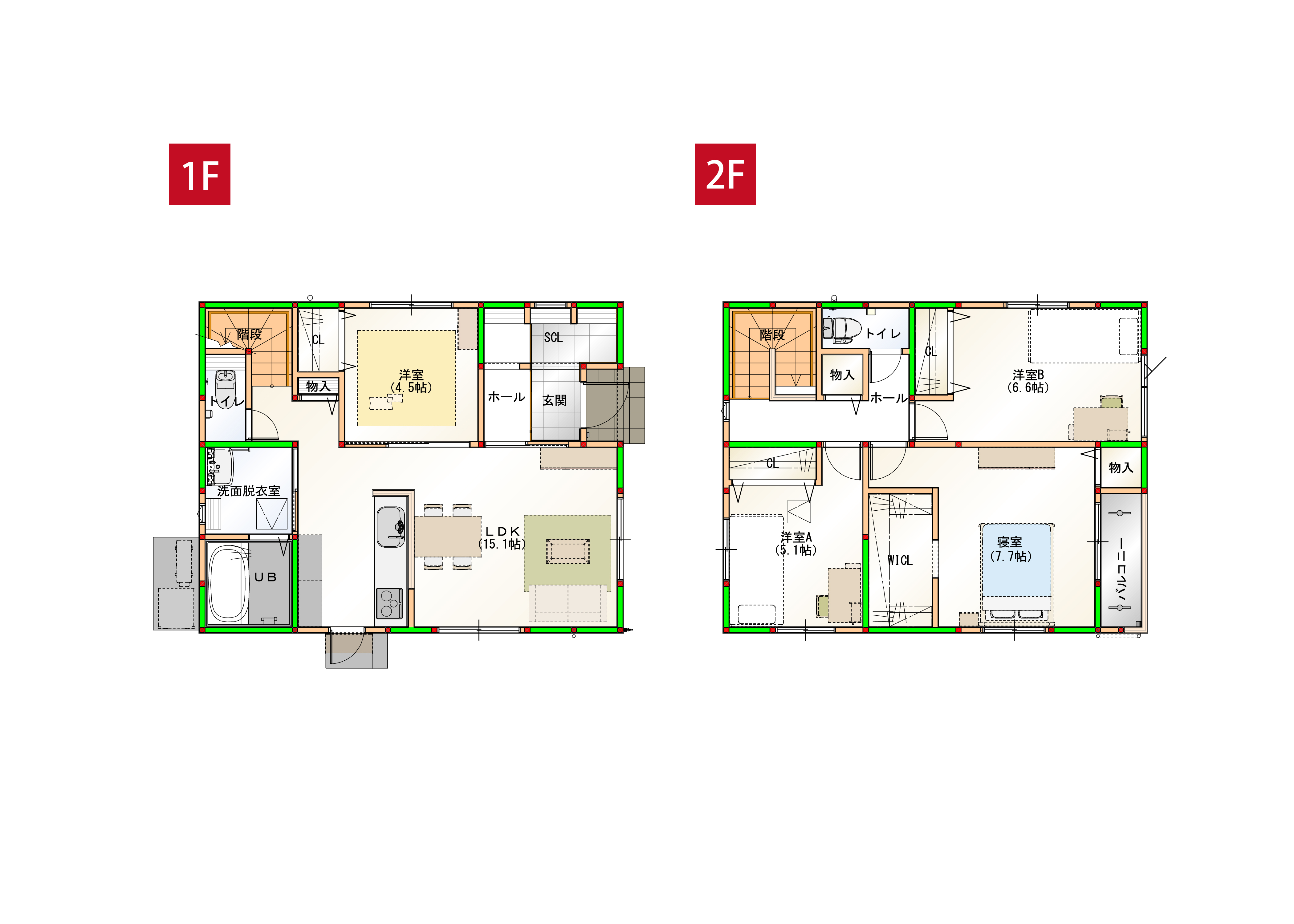 ★間取り:4LDK(1F:LDK15.1帖、洋室4.5帖、2F:寝室7.7帖、洋室5.1帖、洋室6.6帖)