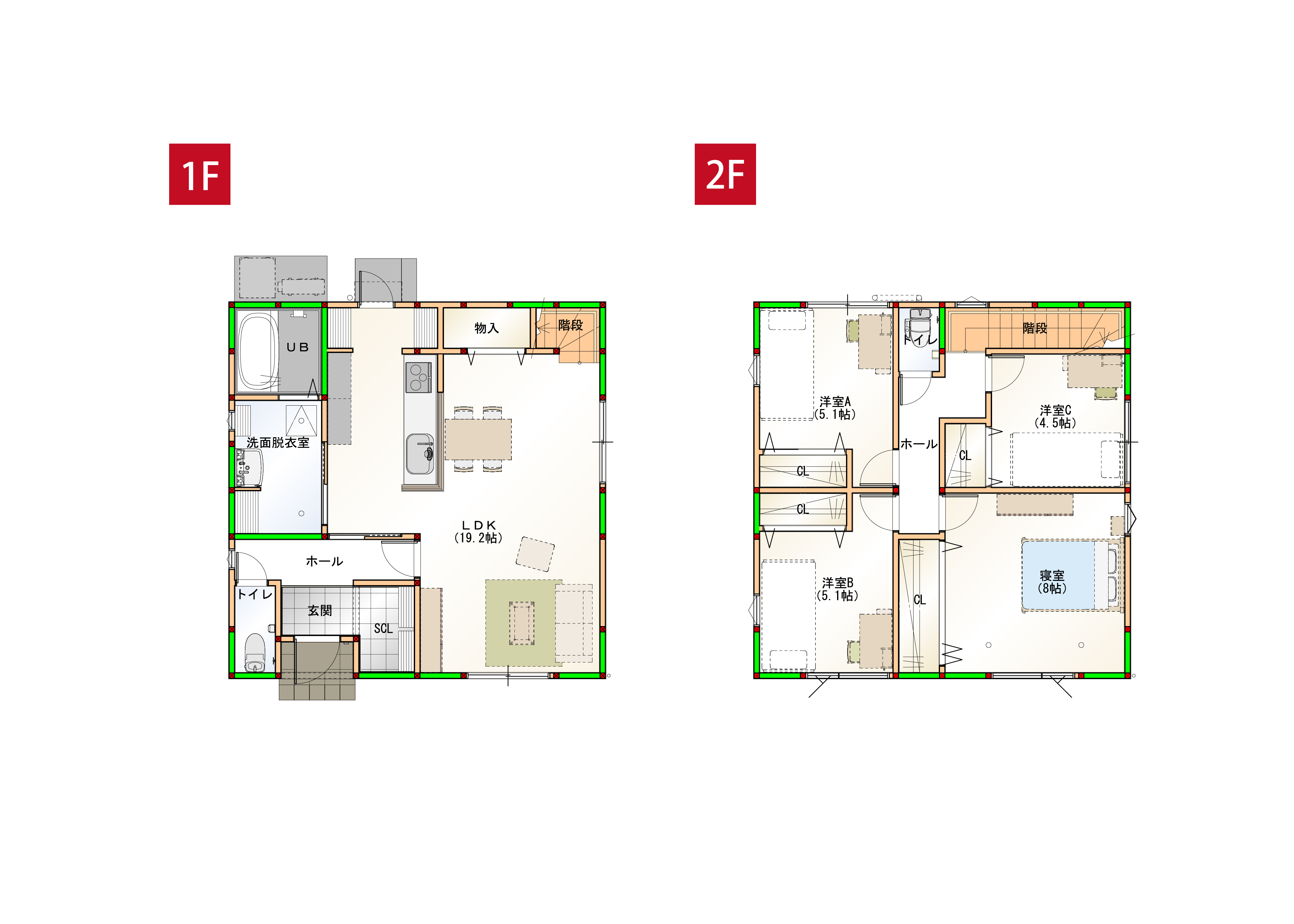★間取り:4LDK(1F:LDK19.2帖、2F:寝室8帖、洋室5.1帖、洋室5.1帖、洋室4.5帖)