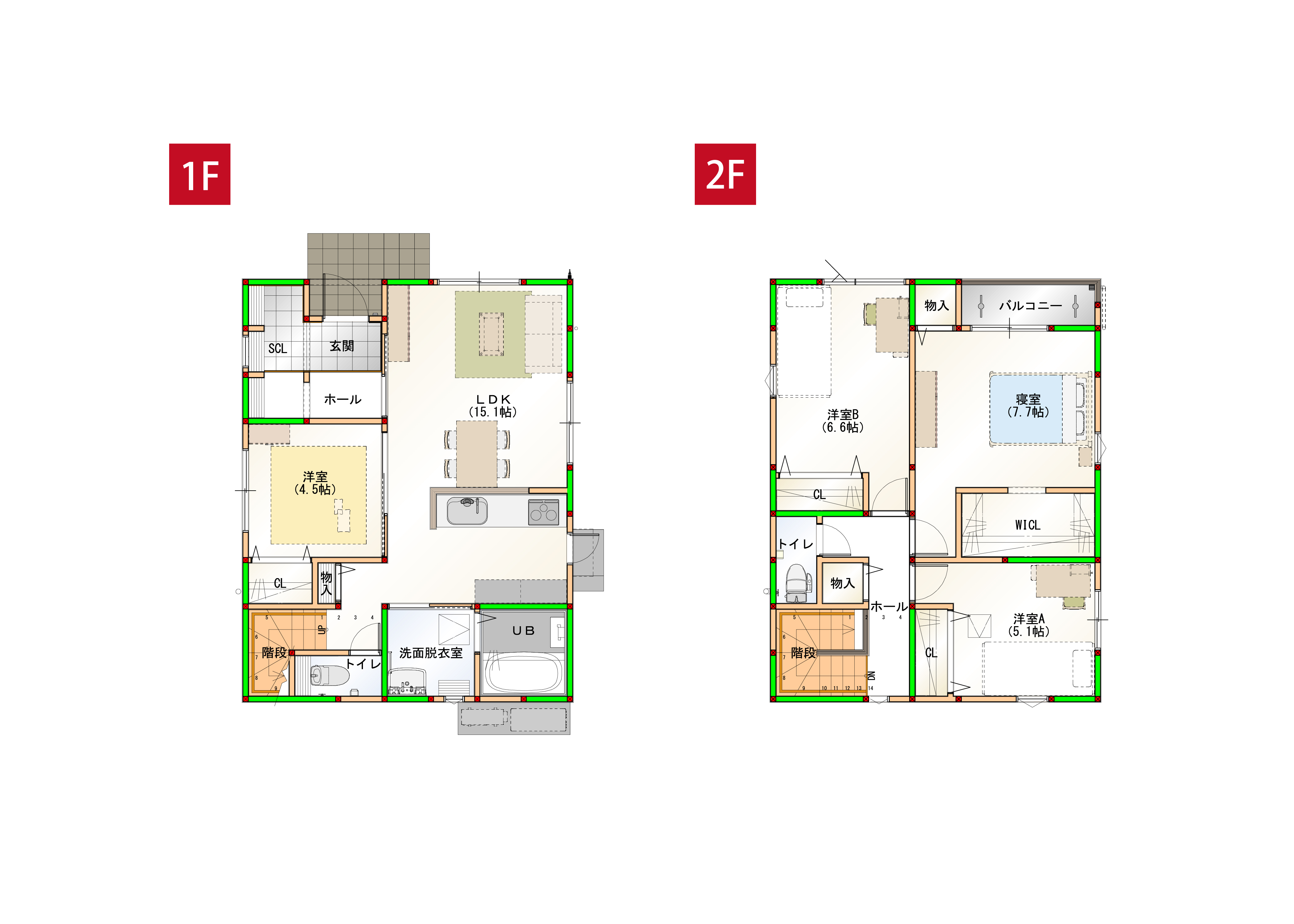 ★間取り:4LDK(1F:LDK15.1帖、洋室4.5帖、2F:寝室7.7帖、洋室5.1帖、洋室6.6帖)
