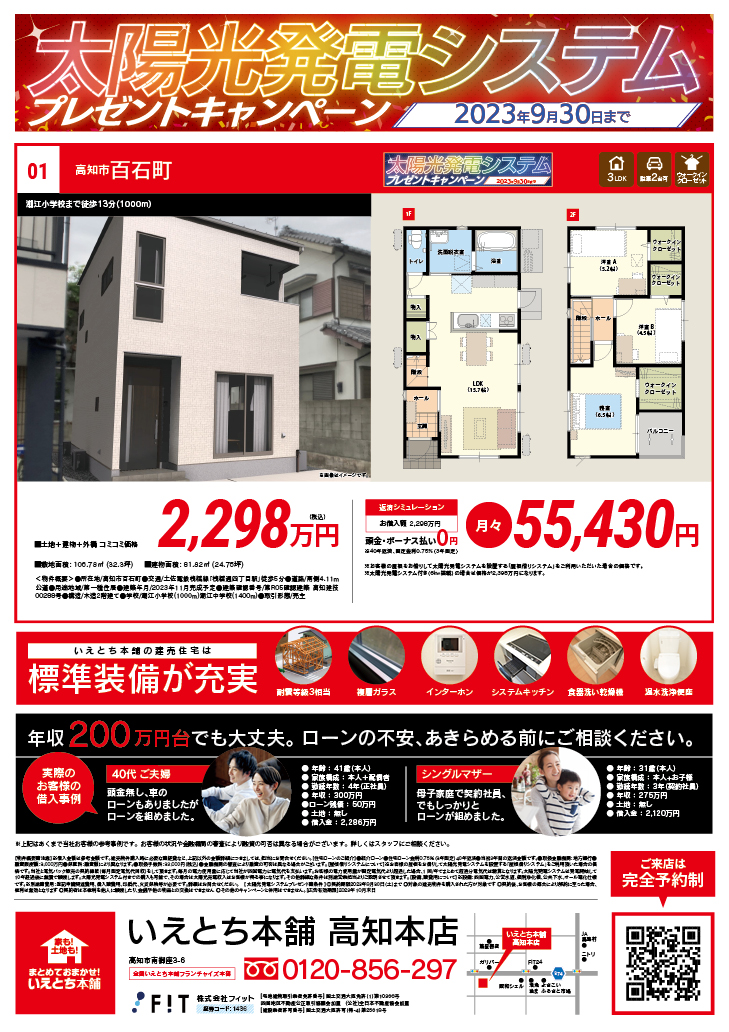 【 太陽光発電システムプレゼント諸条件 】◎契約期限2023年9月30日(土)◎当社が指定している建売物件を購入された方◎契約後、お客様の都合により解約に至った場合、権利は無効となります。