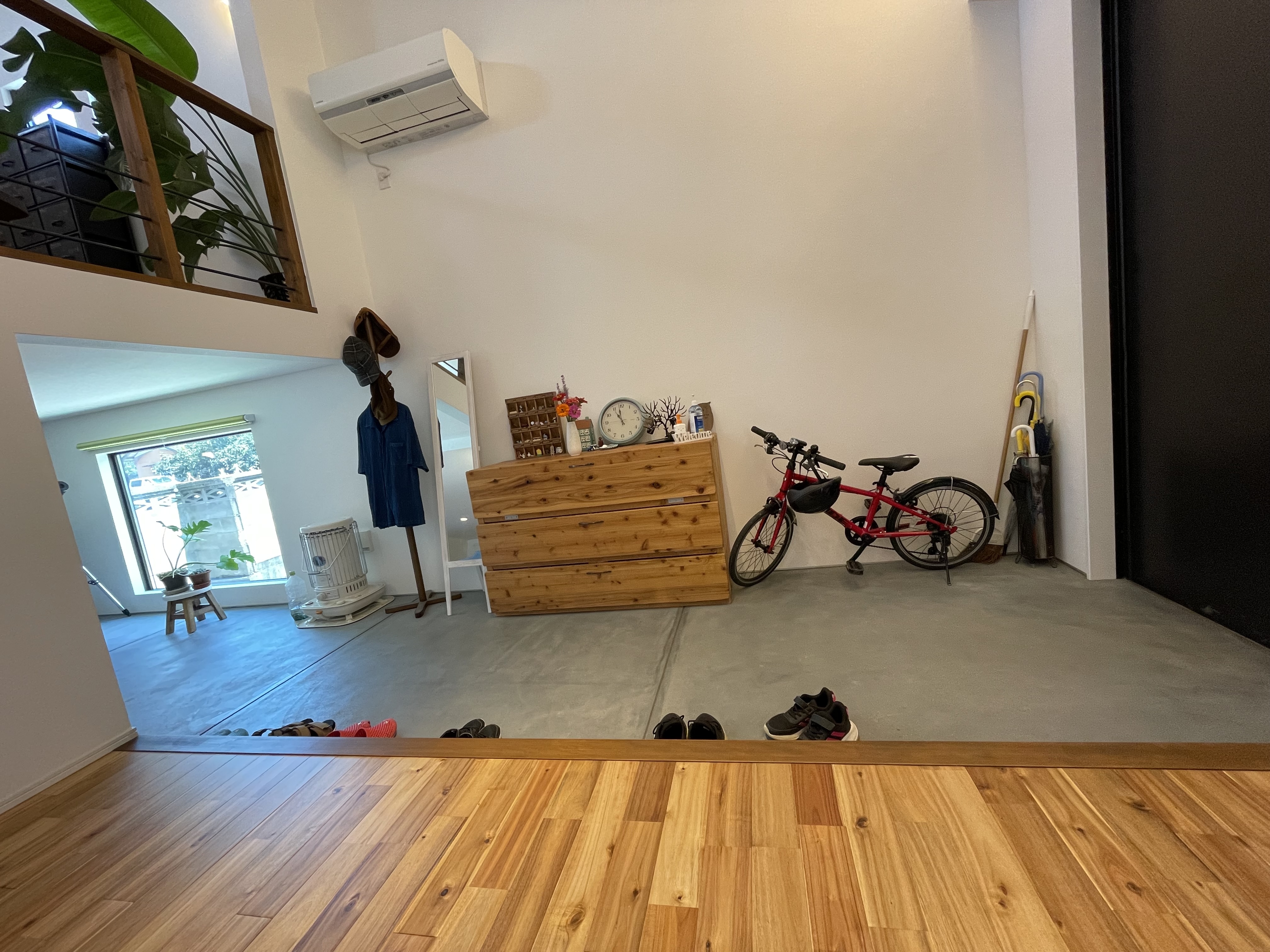 あと、玄関土間スペースが約5畳あるんですが、広々としていて本当に便利です。子どもの自転車やスケボーをそのまま置けますし、ストーブを置けば思ったより寒くありません。子どもがぐるぐる走り回れる間取りも良いですね。家事をしながらでも家族がどこで何をしているのか分かります。