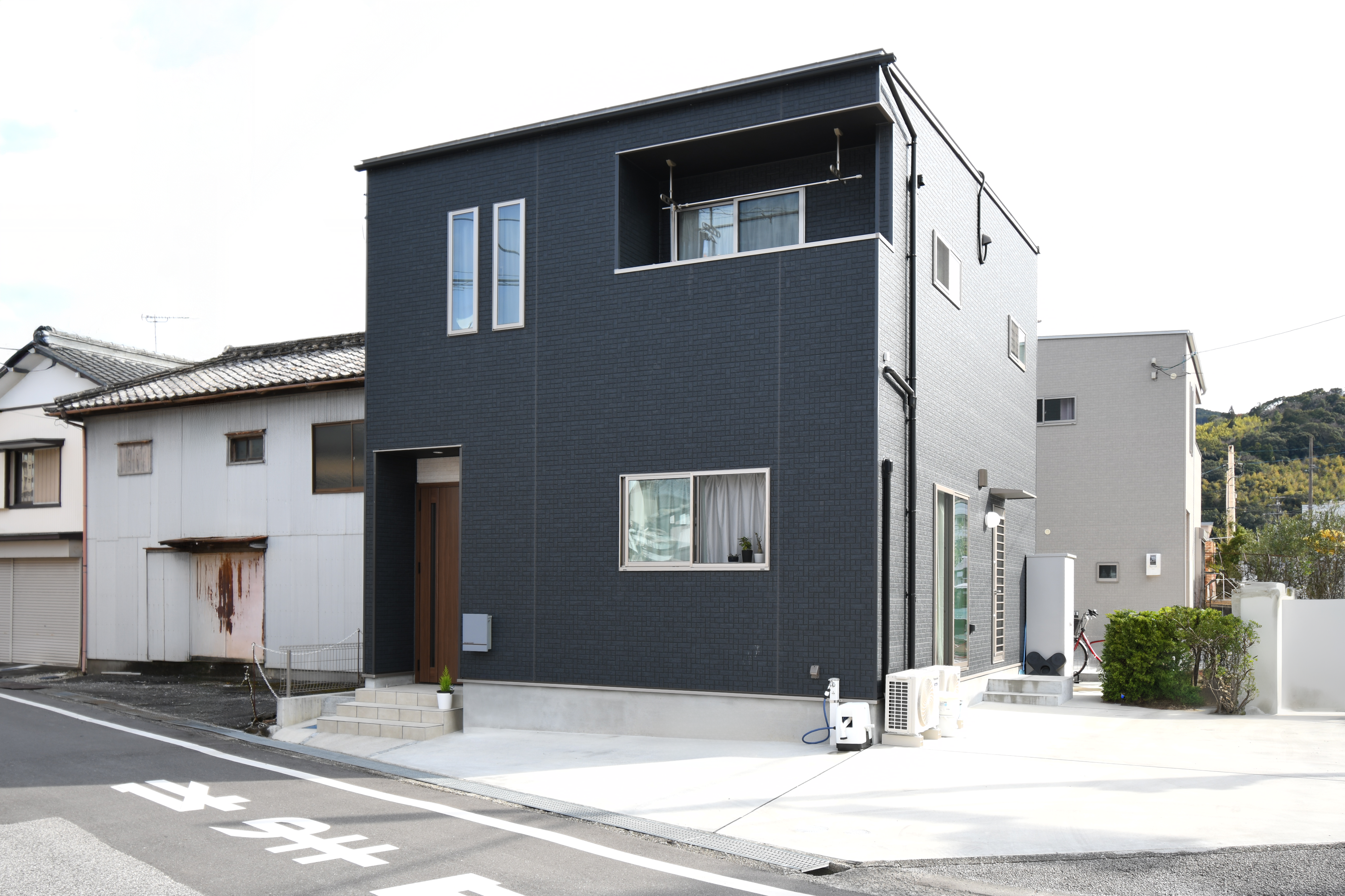 シンプルな黒の外観。駐車場スペースは4台分あり、来客用にも十分に対応できる。