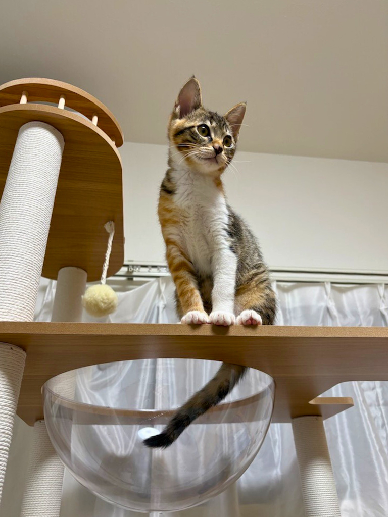 2階の猫専用のお部屋のキャットタワーにのぼってあそぶうずちゃん。