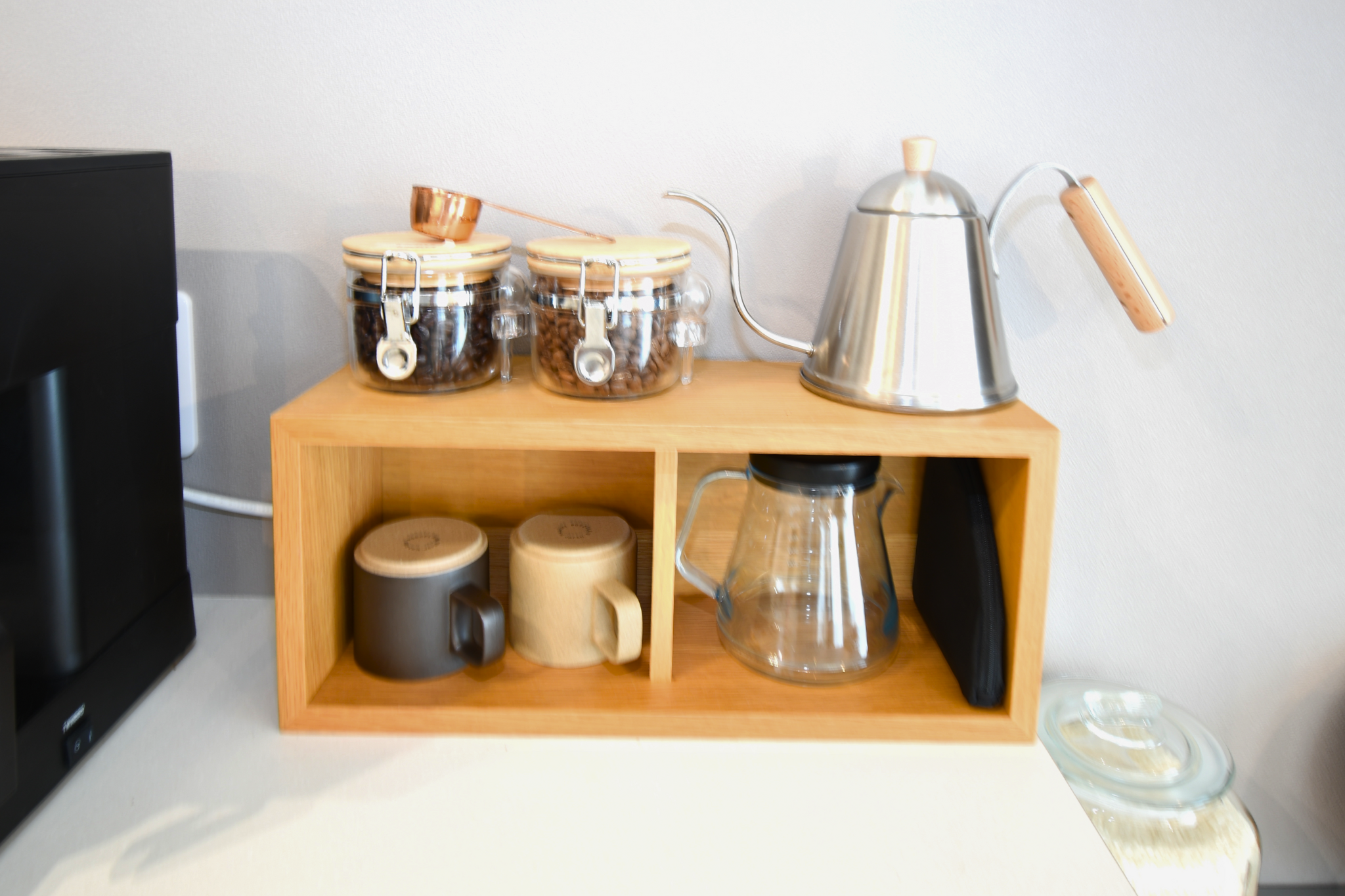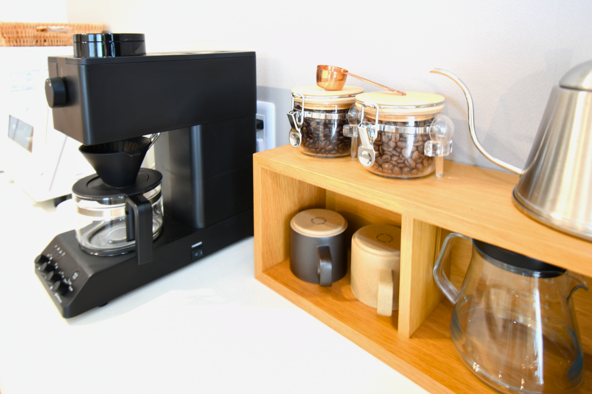 こだわって選んでいるコーヒー豆やツールの並ぶ姿も絵になる空間。まるでおうちカフェのようなキッチンが、家族の時間をやさしく包みます。