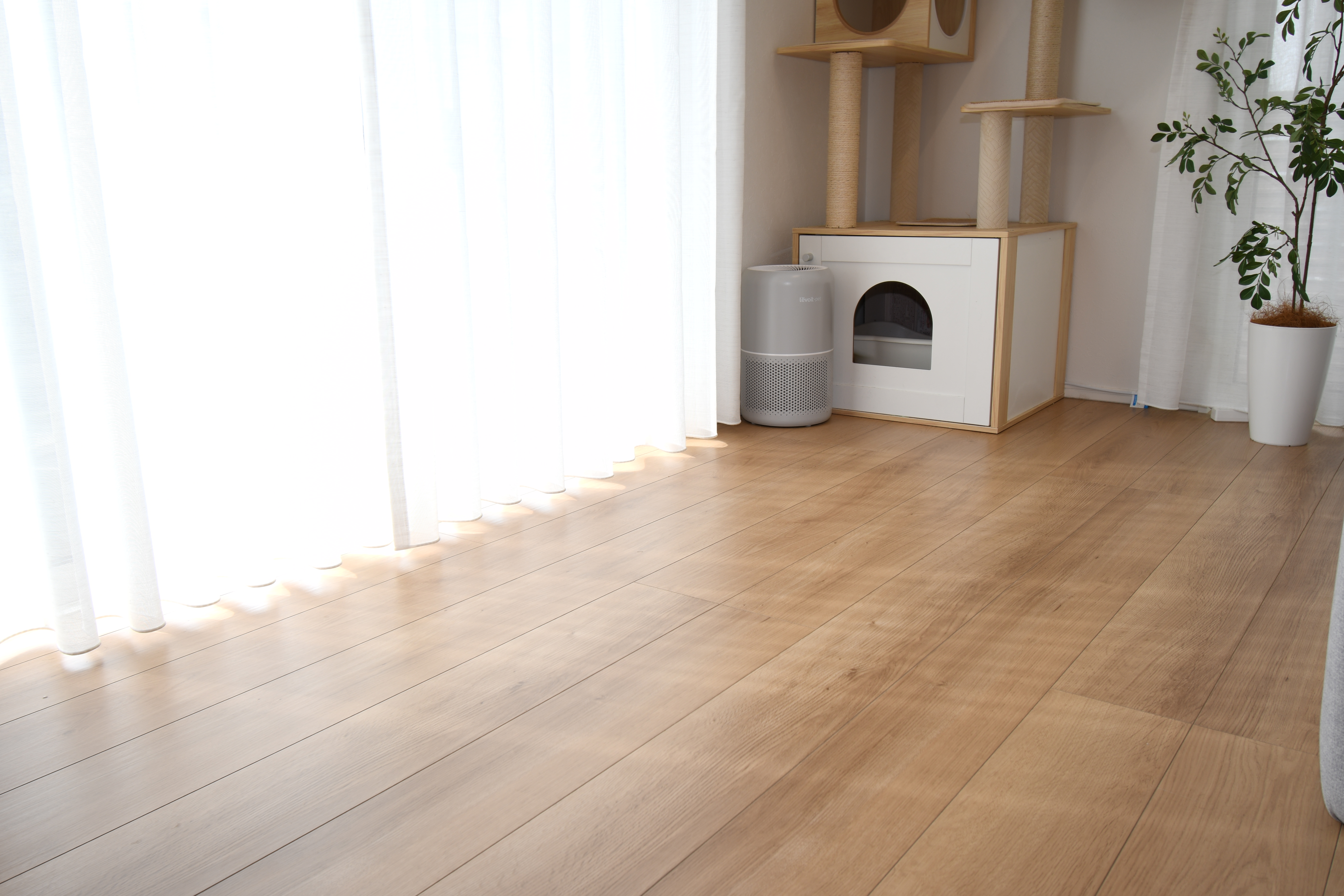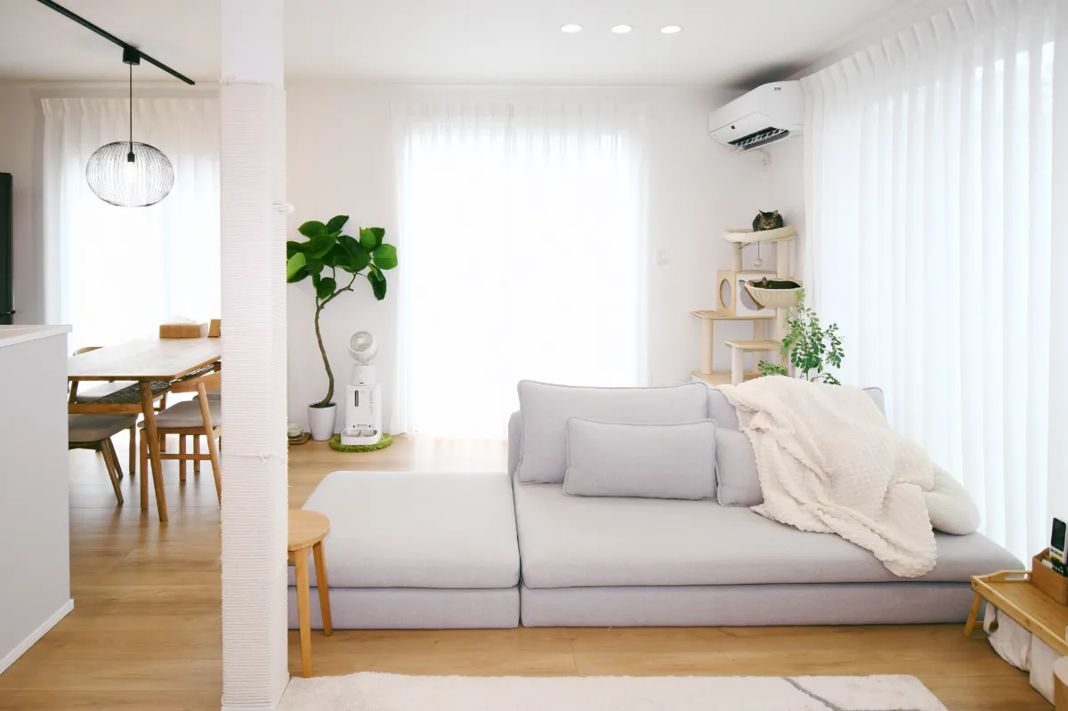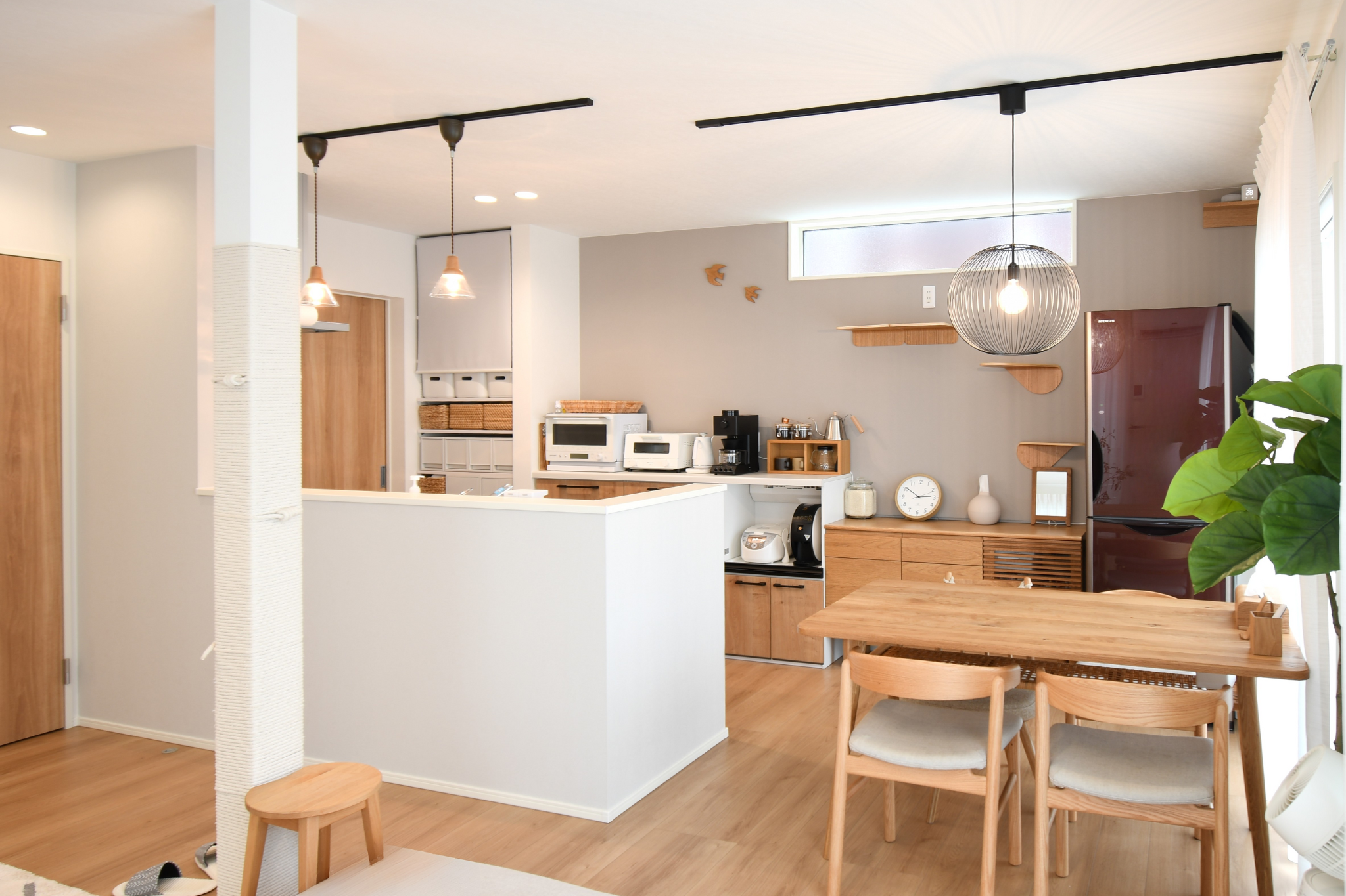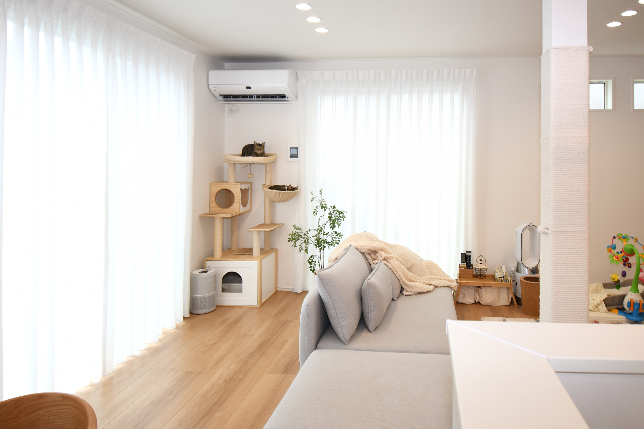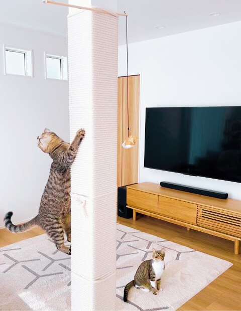 奥様:マイホームを建てたら猫を飼うのが夢だったので、保護猫の「あおくん」と「はるちゃん」を新しい家族として迎えました。どうしても残ってしまうリビングの柱には、自分たちで麻紐を巻いて爪とぎにDIYしました。壁に下地を入れてもらってキャットウォークを取り付けるなど、猫たちも快適に過ごせる工夫を凝らしました。猫たちも、日当たりの良い窓際の空間を気に入っていると思います。