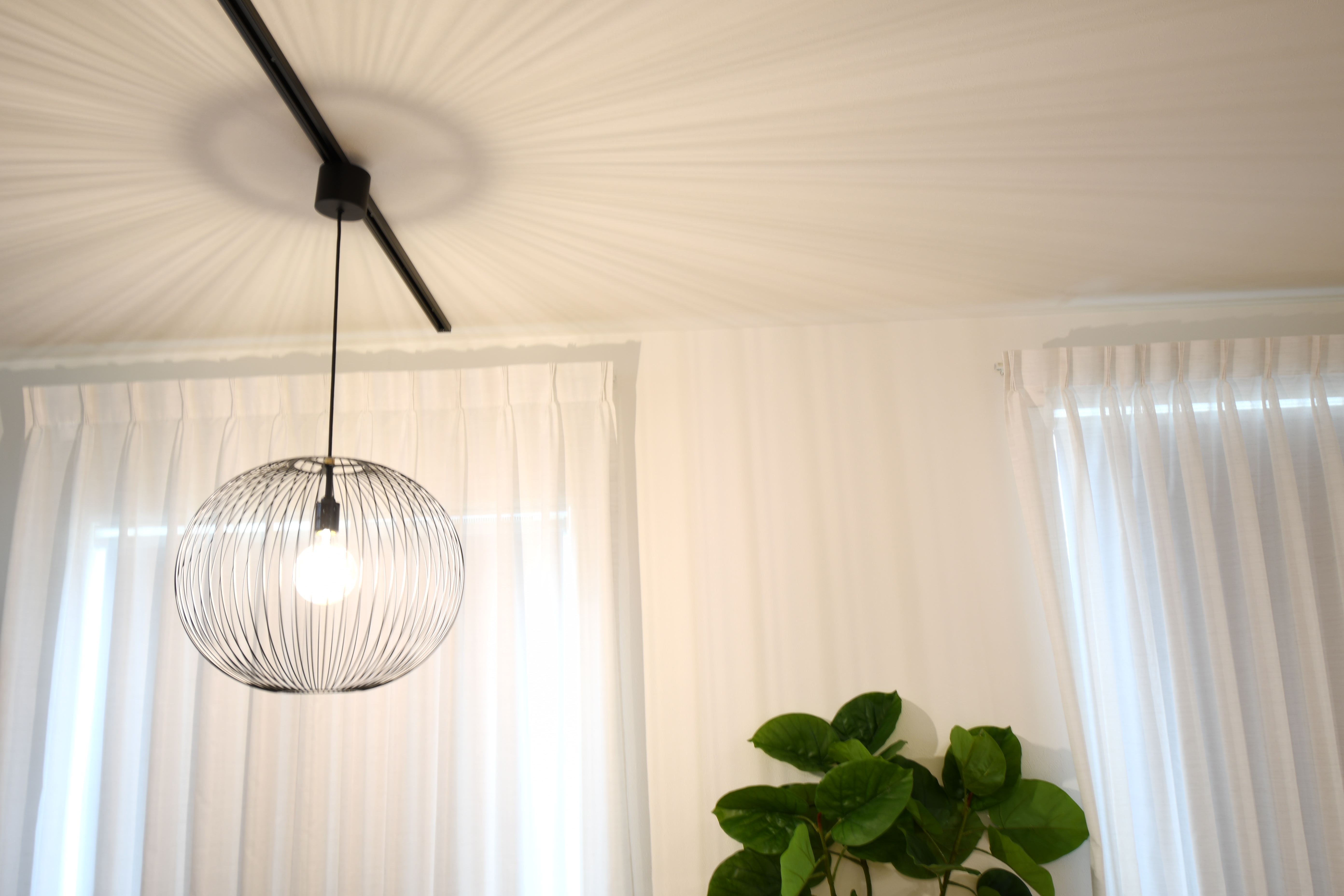 明るい光が差し込むリビング。家具やカーテン、照明にもこだわりが詰まっている。
