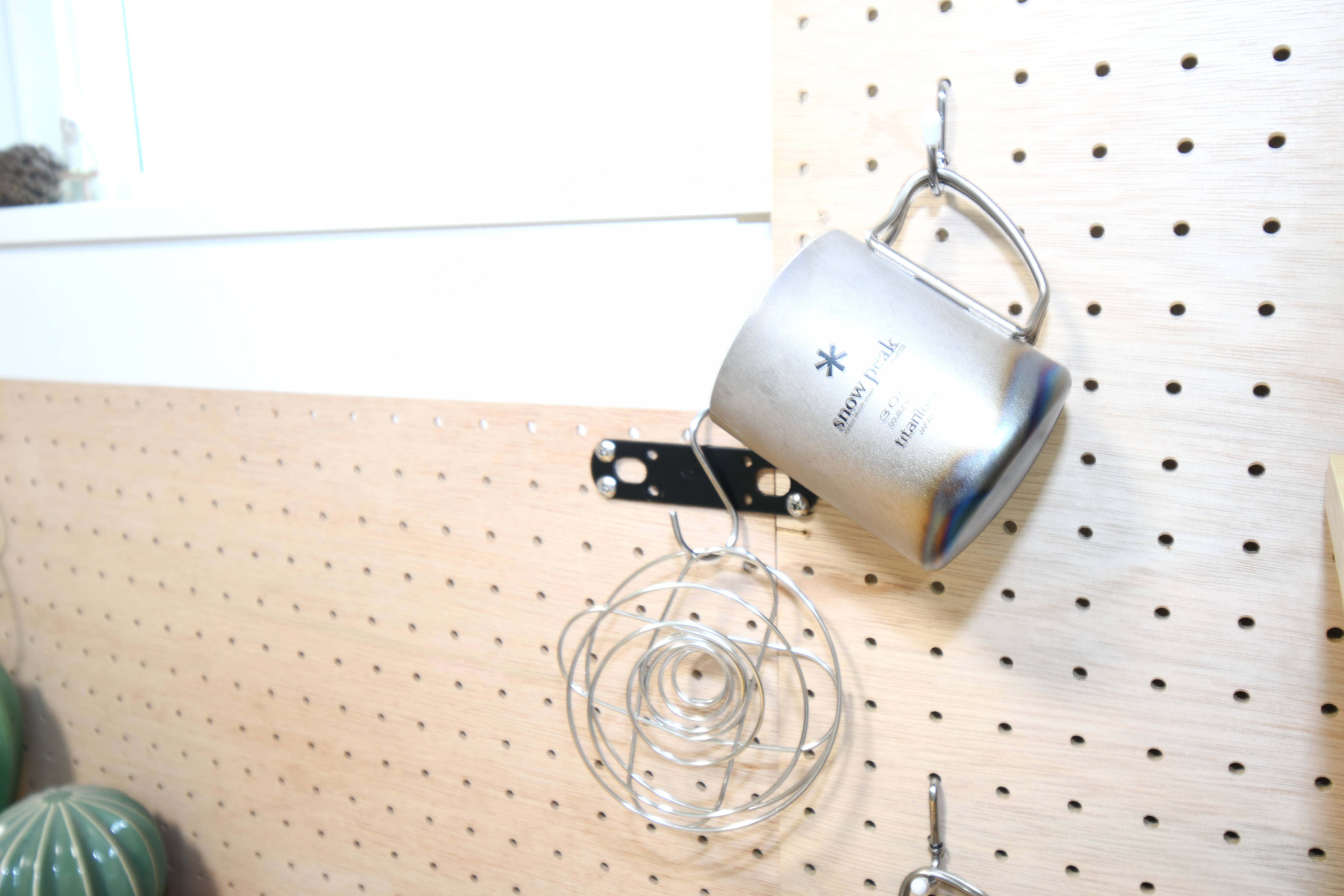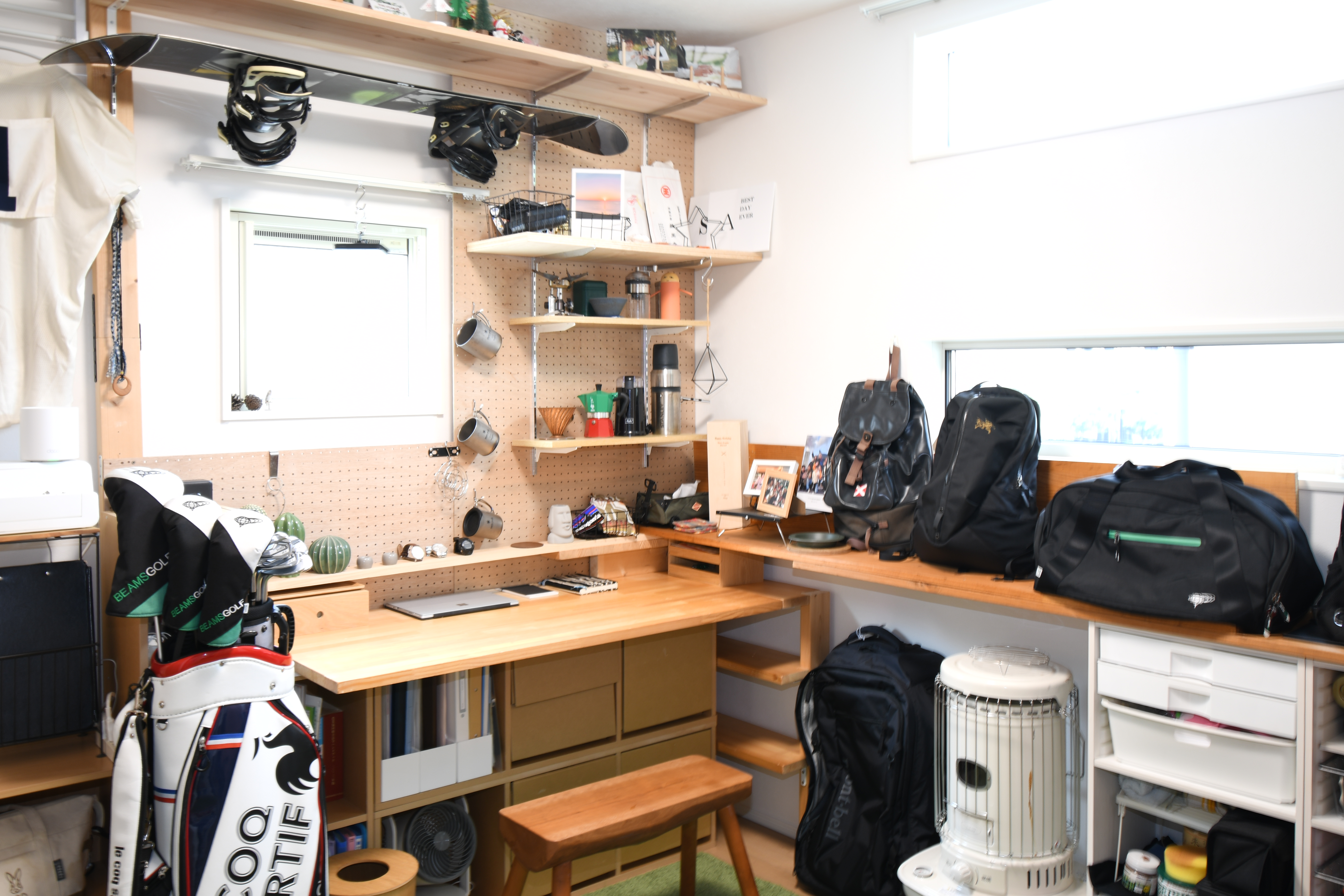 こちらはキャンプなどの趣味も大切にしたいとおっしゃっていたご主人のマイルーム。キャンプなどで使うコーヒーグッズもオシャレにディプレイされている。