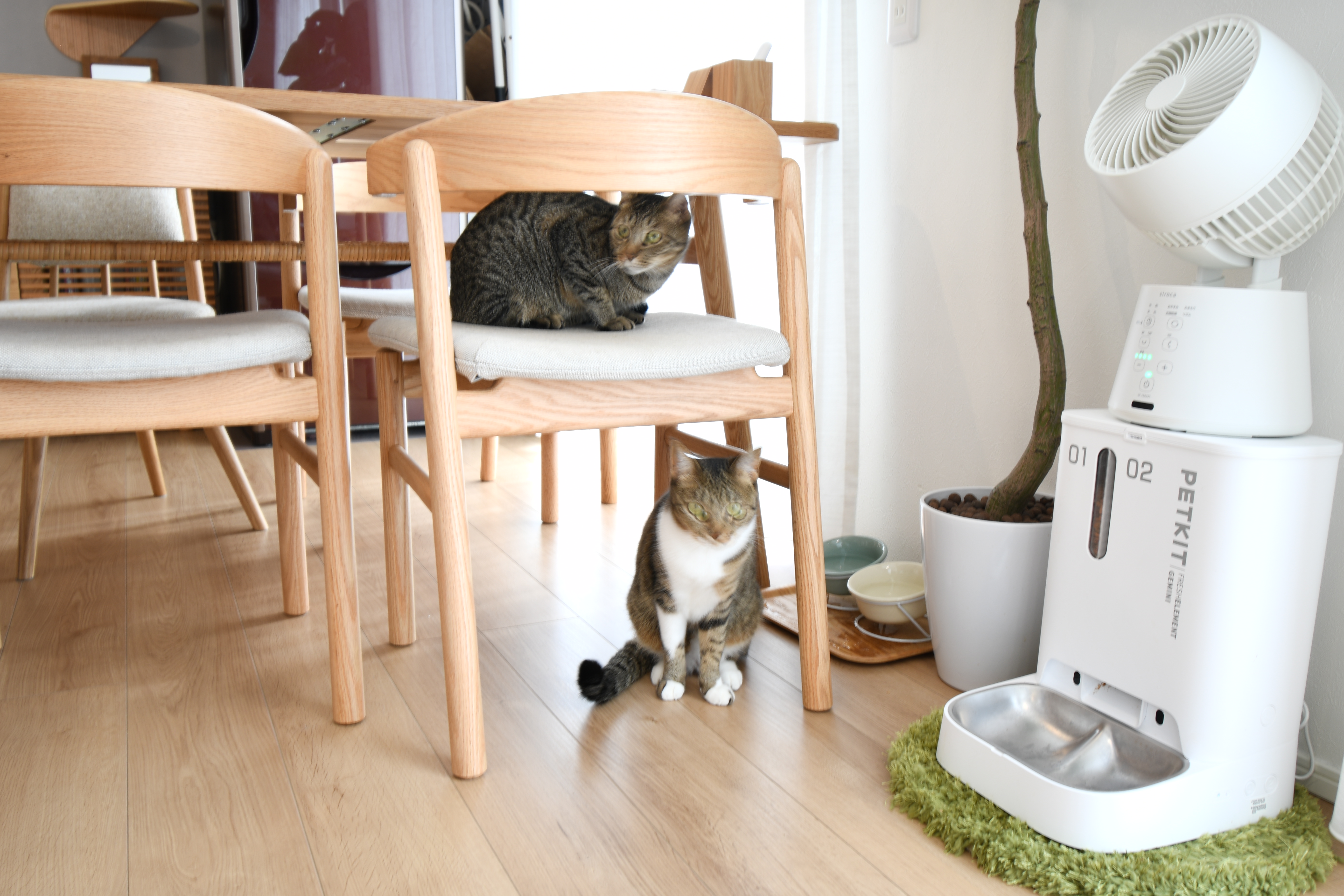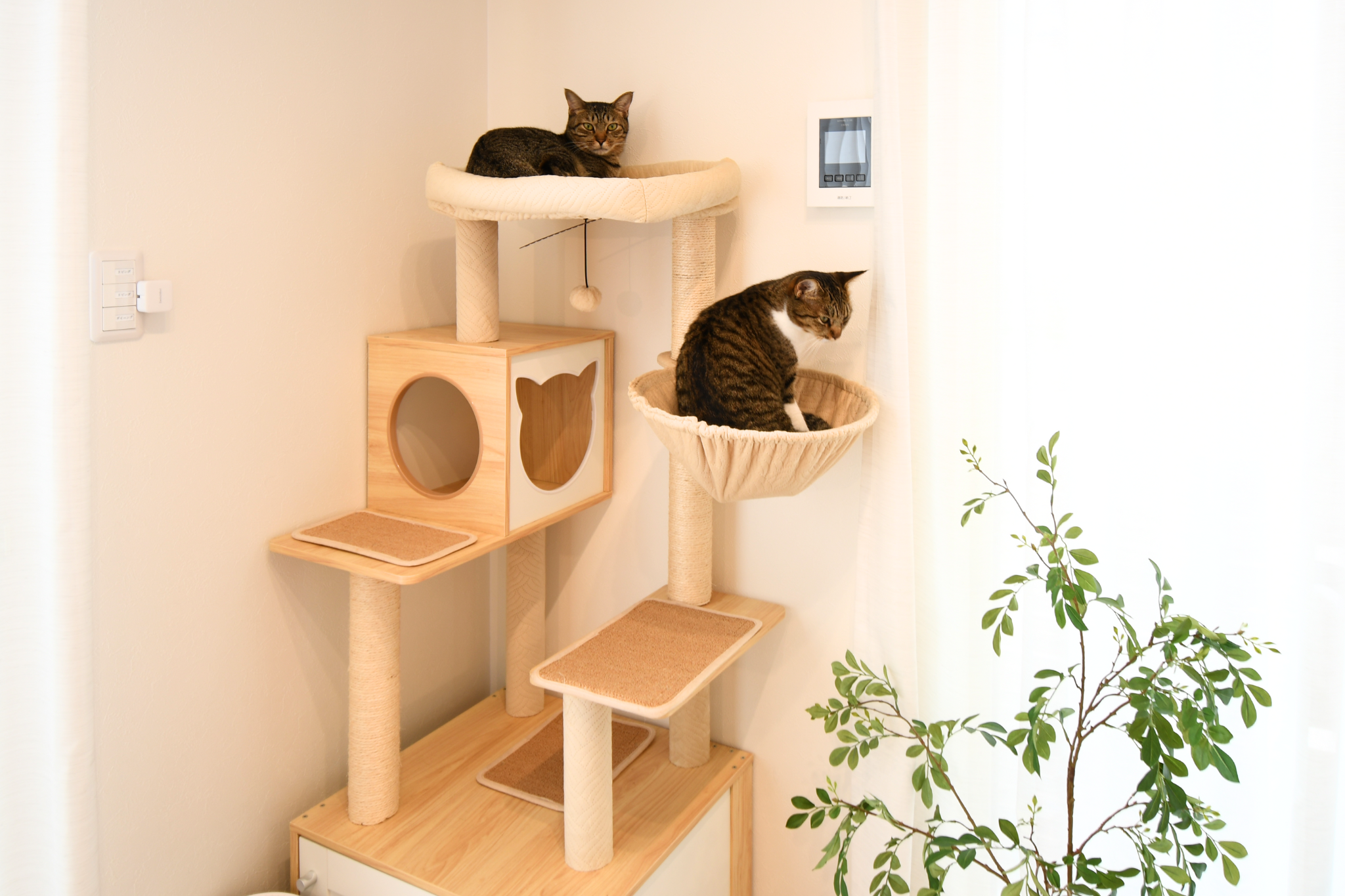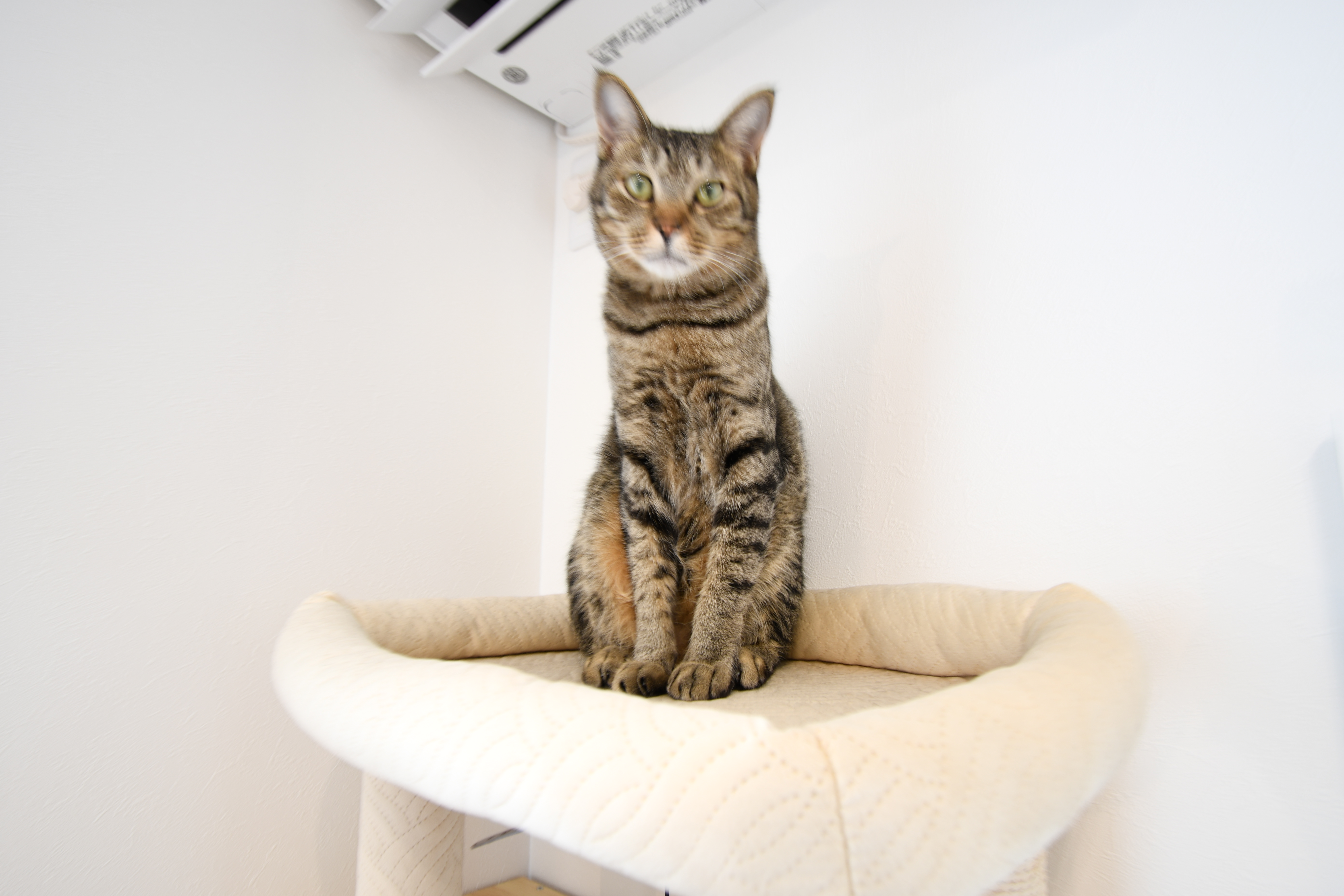 日差しが心地よく広がる窓際にはキャットタワーを設置。インタビュー開始直後の猫ちゃんたちは、お気に入りの場所からこちらを偵察中。