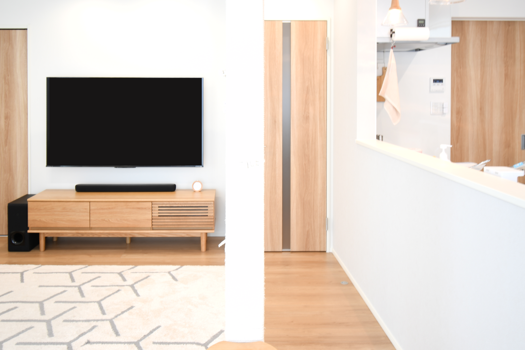 奥様:「家族が集まる広いリビング」が一番のこだわりです。もともとのプランではリビングの隣に洋室があったのですが、その壁を取り払い、ひとつながりの大きなLDKにしてもらいました。日当たりを最大限に確保するために窓を大きくし、光がたくさん入るように工夫しました。その結果、玄関が家の裏側になったのですが、おかげで理想の明るいリビングが実現できたので、この間取りにして大正解でした。