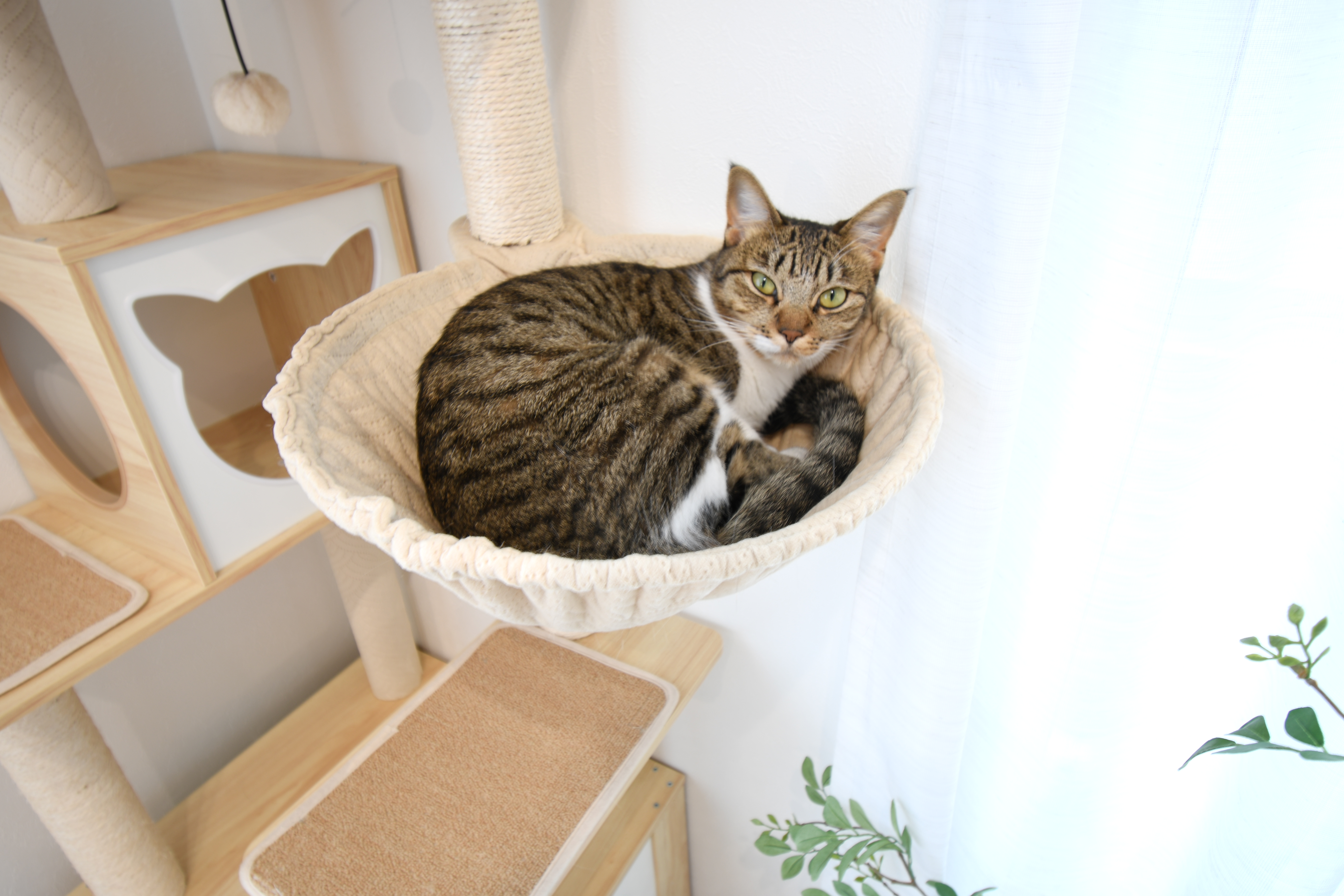 日当たりの良い窓際のキャットタワー。猫ちゃんたちの特等席。